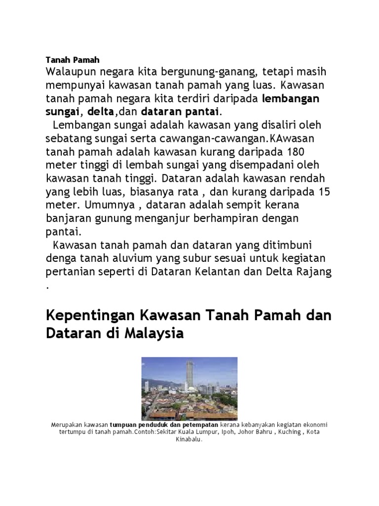 8kepentingan kawasan tanah pamah di malaysia Contohnya delta rajang dataran baram dan dataran lupar. Kepentingan kawasan tanah pamah dan. Sesetengah tanah pamah di Malaysia beralun dan berbukit.